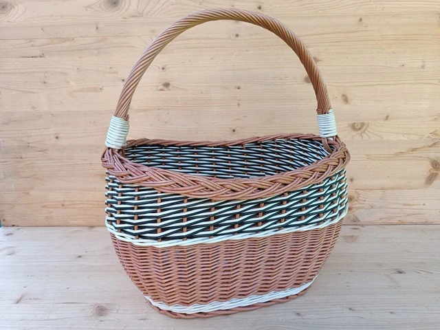 Ažura z loupaného proutí s copánkovou uzavírkou. Dekorativní pruh dvěma pruty v bílé a hnědé barvě a dva opletky z bílého proutí. Rozměry: 41x28 cm, výška 26/46 cm.
