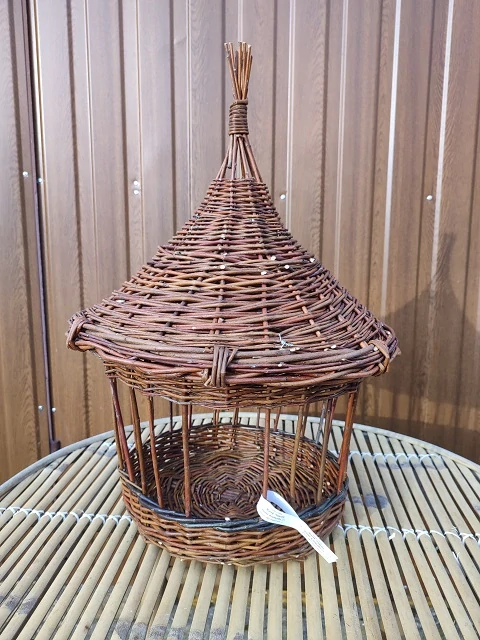 Budka pro ptáky z neloupaného proutí z naší výroby - průměr střechy cca 42 cm, průměr dna cca 30 cm,výška cca 58cm.
