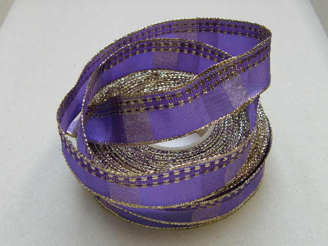 Stuha s lurexem a drátem 25 mm fialová, doplňena kovovými proužky "zlaté" barvy.