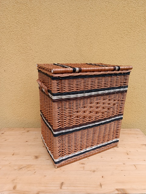 Proutěná vysoká truhla s barevnými opletky. Rozměry: 50x30 cm, výška 56 cm.